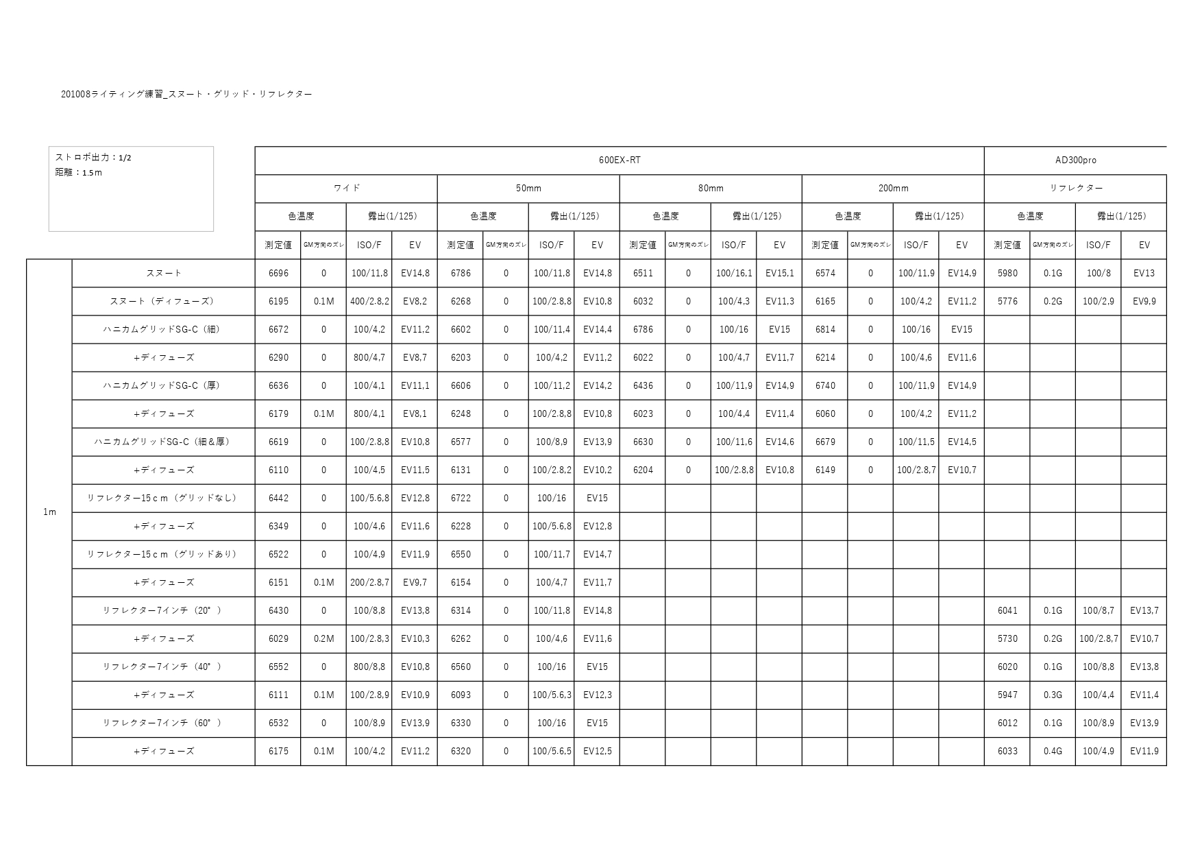 ●色温度を測ったが、値がバラバラであまり信用できない結果になった。クリップオンストロボの方はアクセサリ―をつけると300~500K下がる。ディフューズをするとさらに300~500K下がる。モノブロックはアクセサリーをつけてもあまり色温度がさがらなかった。ディフューズすると100~300Kくらい色温度が下がった。