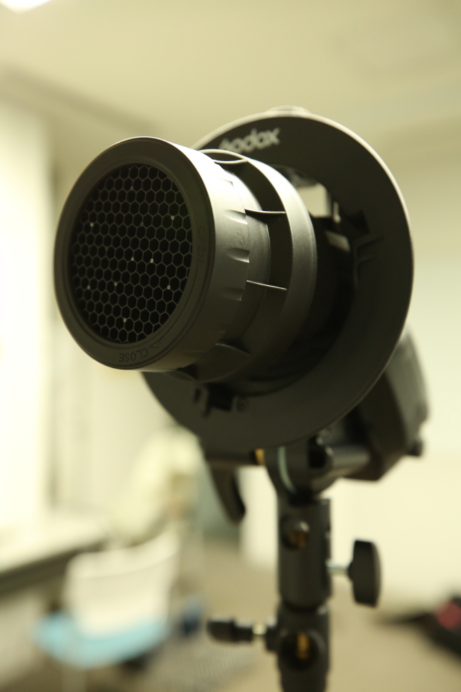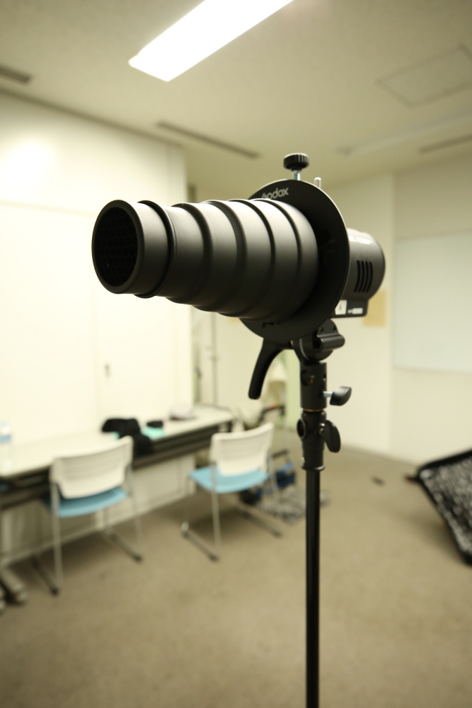 ①ストロボにスヌート・グリッド・リフレクターをつける