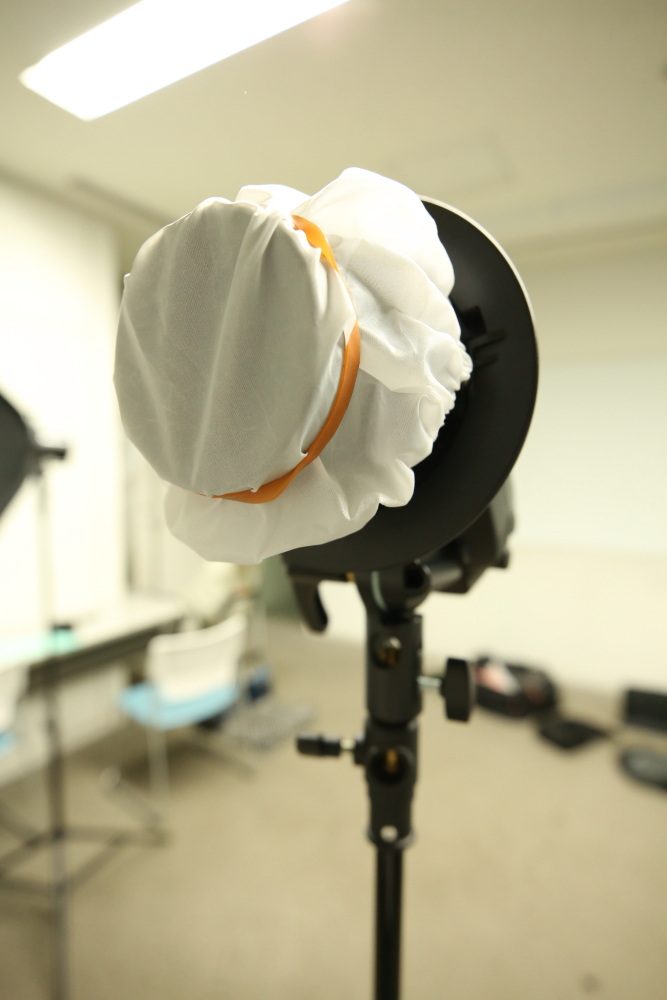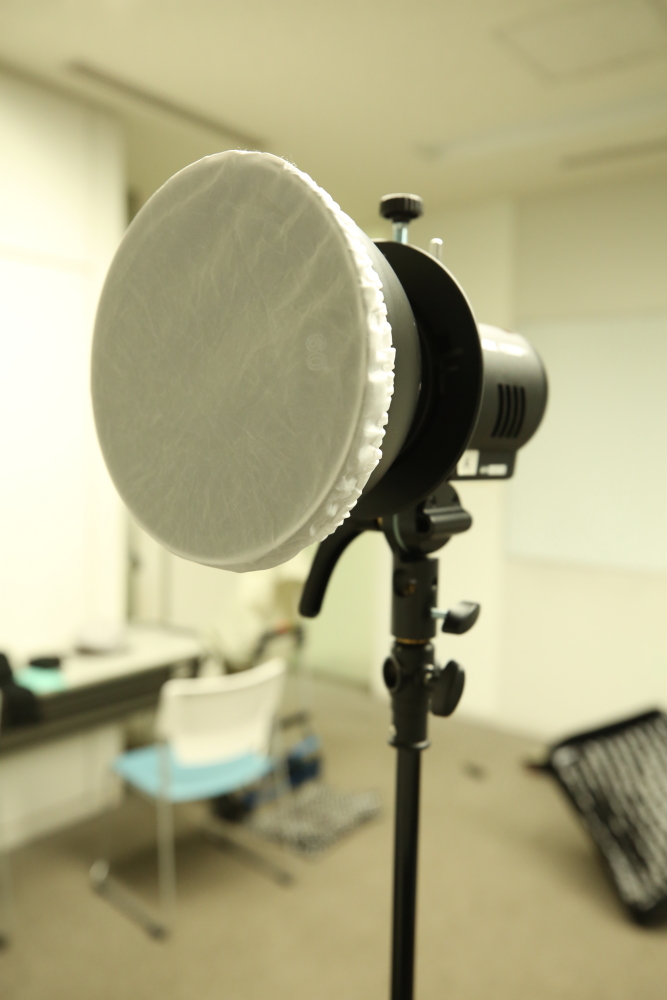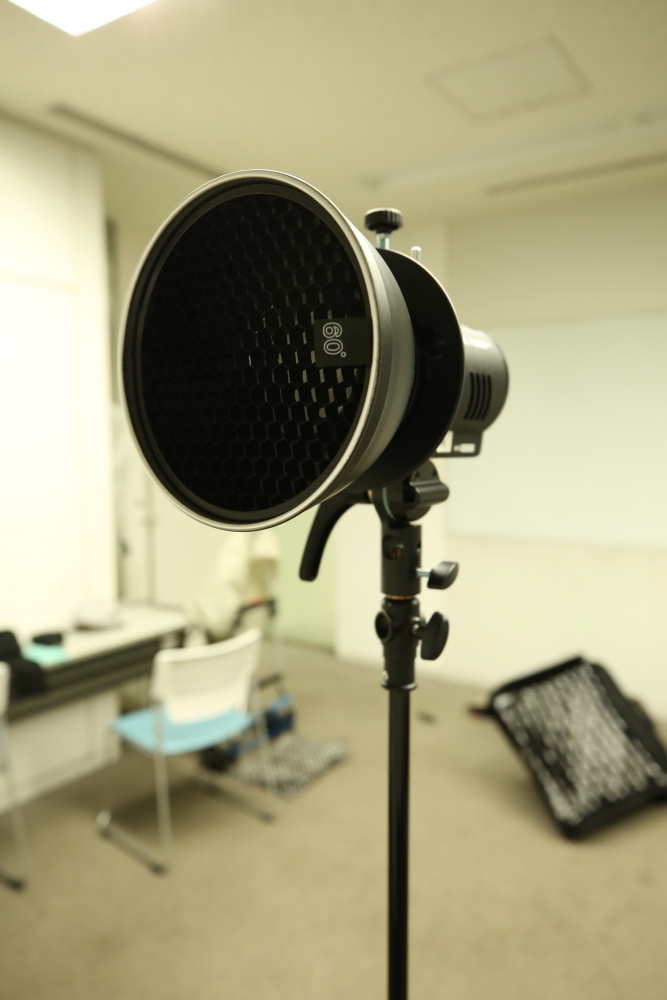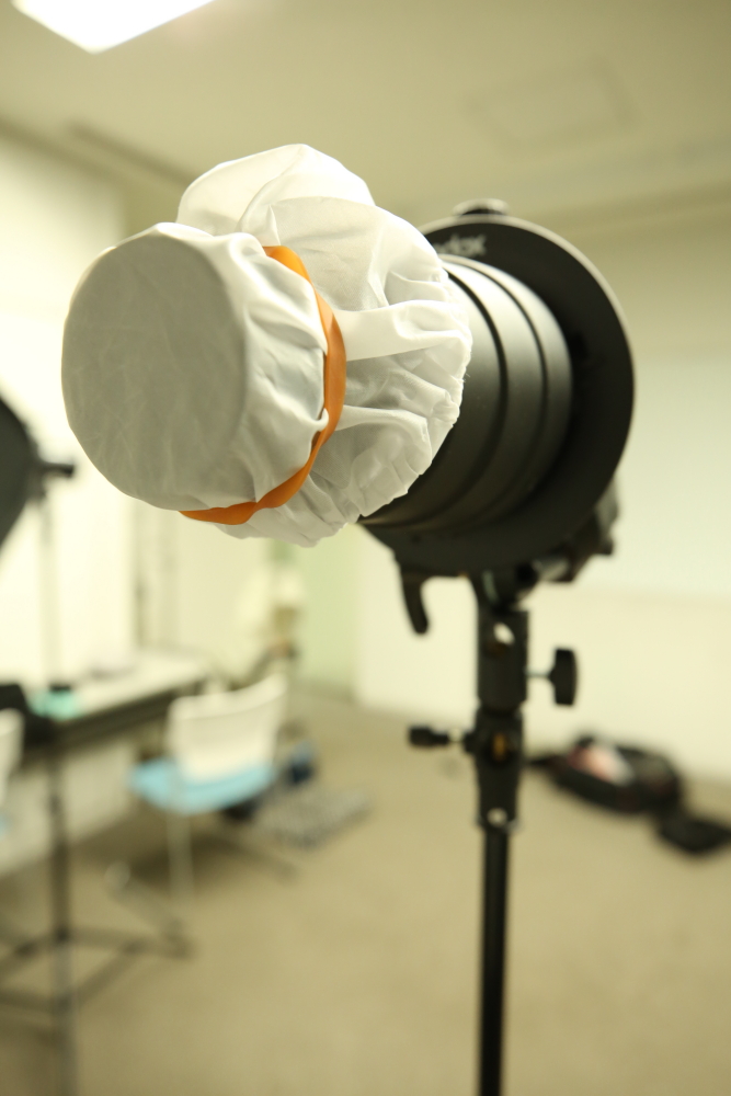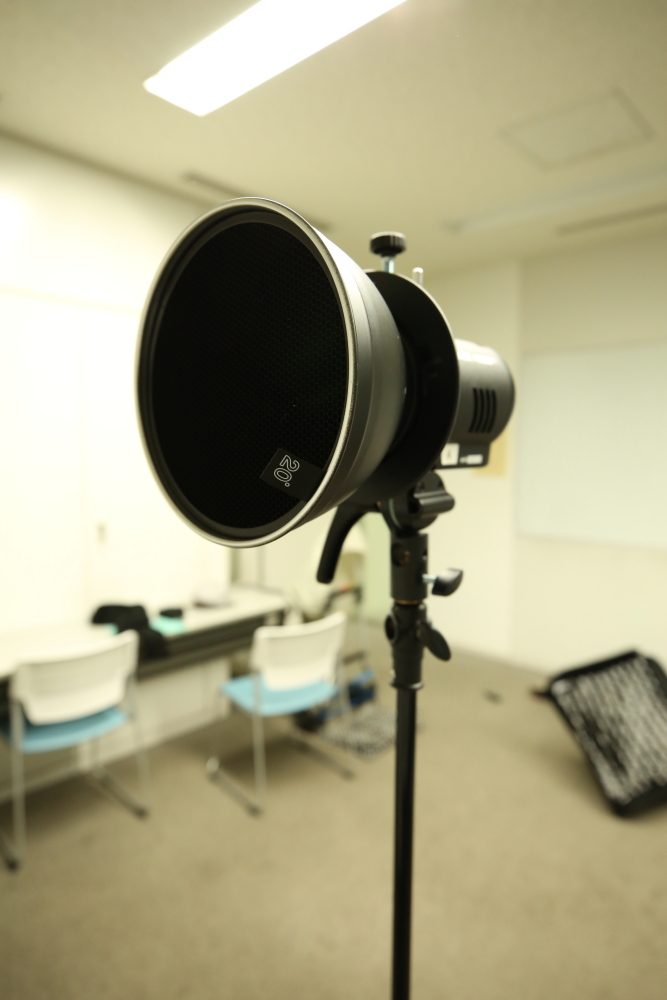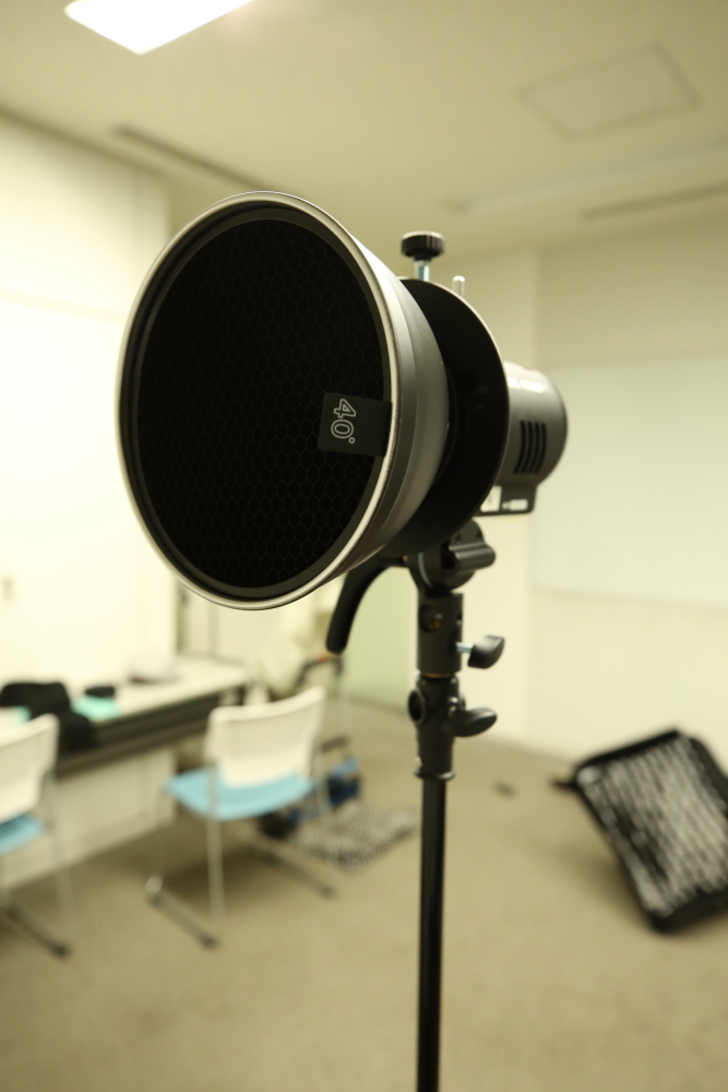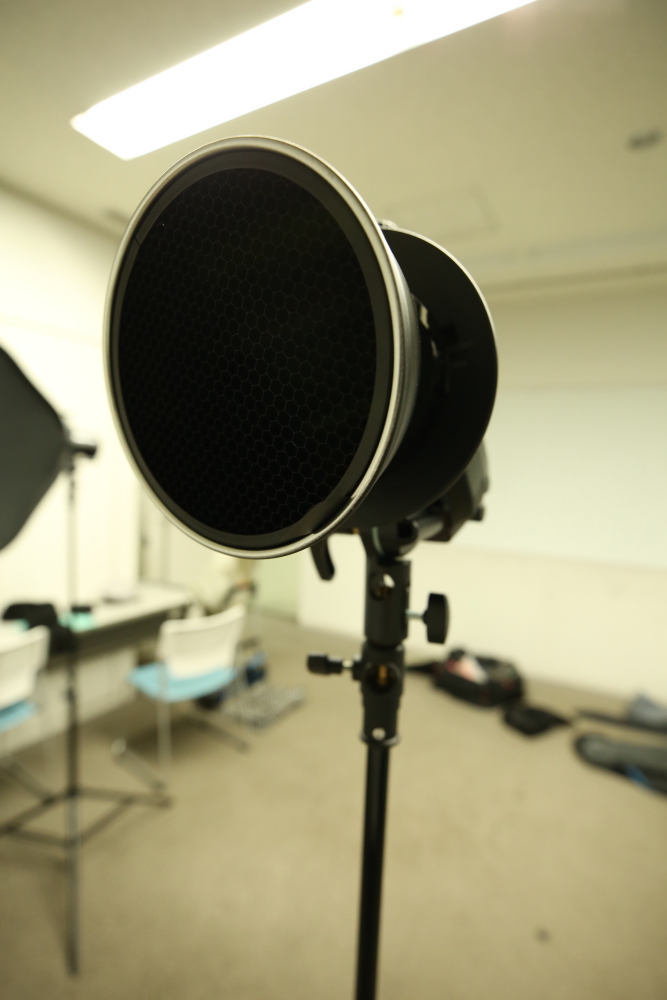 - ①ストロボにスヌート・グリッド・リフレクターをつける